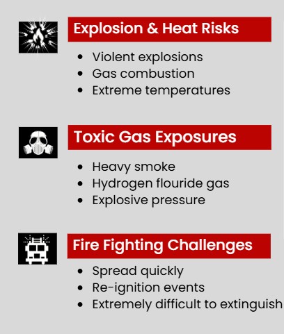 Furthermore, if you store groups of these batteries together in a space, one battery or cell overheating can set off a chain reaction to the other neighboring bodies, where greater overheating, melting, smoking, fire, gas, and explosions (thermal runaway) are the result. Battery misuse or internal short circuit defects from manufacturing, improper charging, dropping, puncturing, damaging, or exposing the battery to liquids and excessive temperatures can also create thermal runaway, which can be hard to extinguish once started.